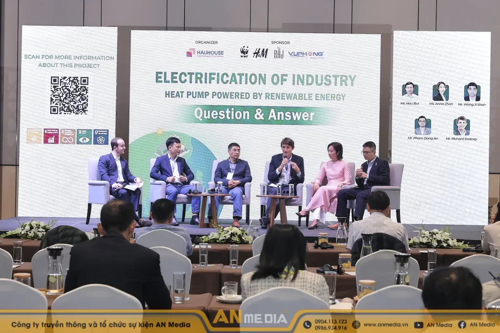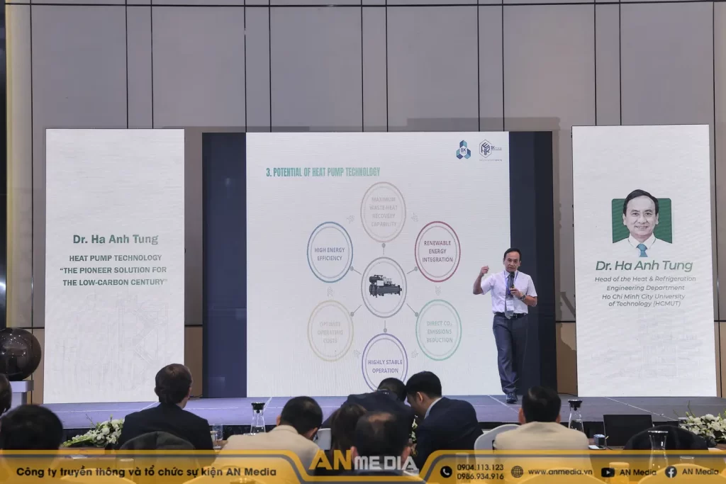 Xuyên suốt các phiên trình bày của TS. Hà Anh Tùng hay các chuyên gia từ WWF về công nghệ Bơm nhiệt (Heat Pump), mọi thông tin đều được trình bày trực quan nhờ dịch vụ thiết kế hình ảnh trình chiếu chuyên nghiệp của AN Media. Từng slide dữ liệu, từng biểu đồ về chuỗi cung ứng dệt may đều được đội ngũ chúng tôi tối ưu hóa về mặt thẩm mỹ, giúp đại biểu dễ dàng nắm bắt các giải pháp tối ưu năng lượng trên màn hình lớn.